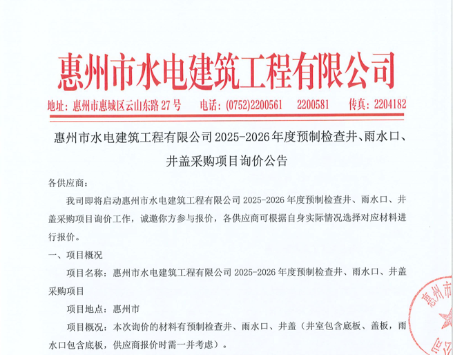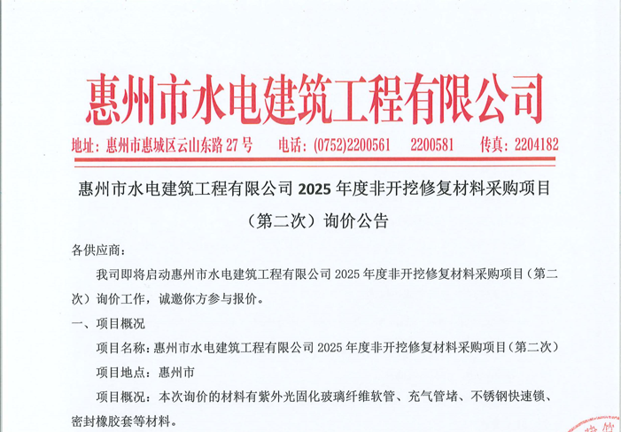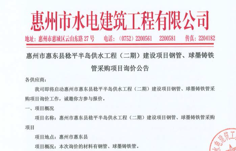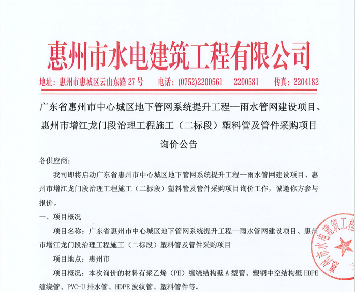 廣東省惠州市中心城區地下管網系統提升工程—雨水管網建設項目、惠州市增江龍門段治理工程施工(二標段)塑料管及管件采購項目詢價公告……
